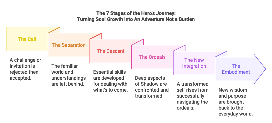 Through the architecture of the Hero's Journey (see diagram below), and enhanced qualities of mutual support that are unfortunately quite uncommon in the world, NWTAs blend masterfully designed sequence of processes, ritual, and ceremony, to facilitate participants in connecting more deeply and fully with their inner life, higher purpose, and each other, so they can more fully embrace their most authentic self.